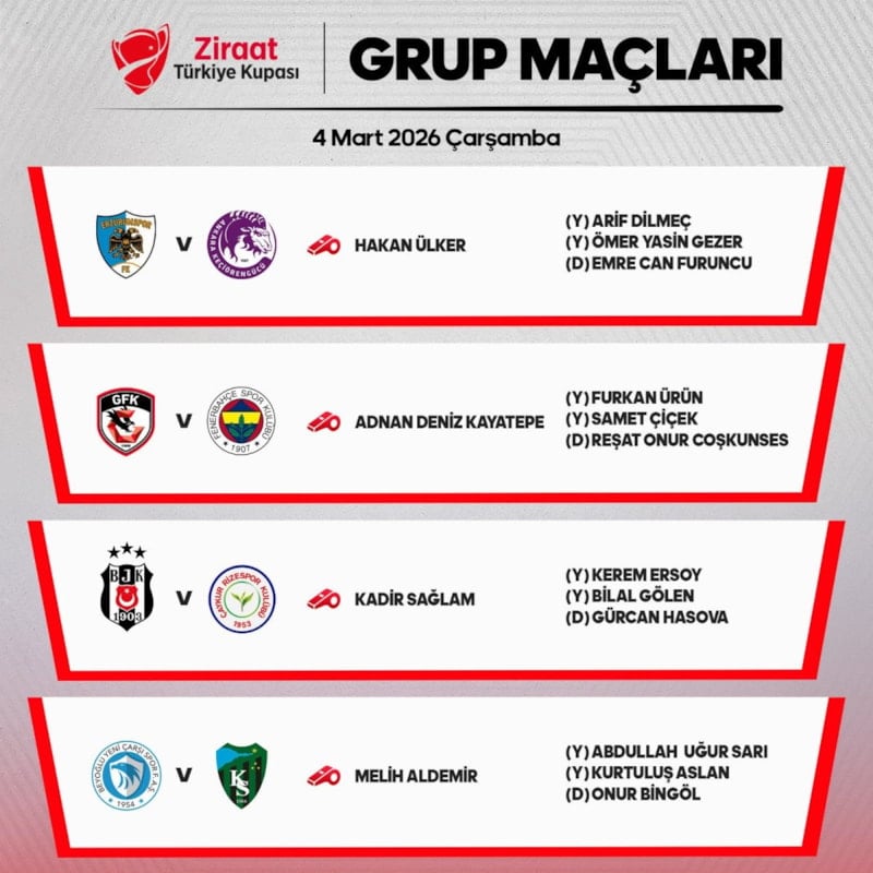 Merkez Hakem Kurulu, Türkiye Kupası grup aşamasının 4. ve son haftasında yarın oynanacak maçları yönetecek hakemleri duyurdu.