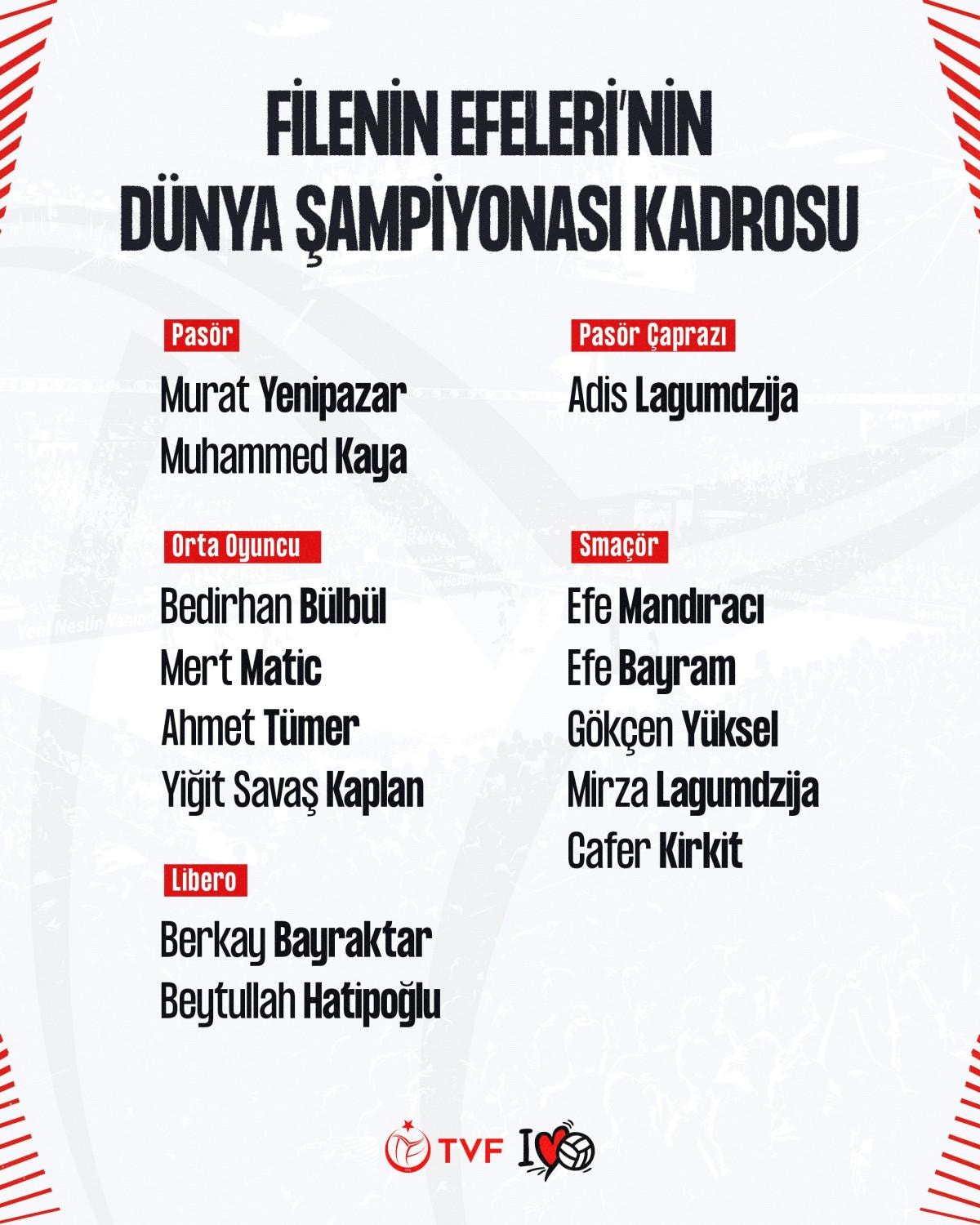 Türkiye Voleybol Federasyonu'nun açıklamasına göre, 12-28 Eylül tarihlerinde yapılacak organizasyonda ay-yıldızlı formayı şu isimler giyecek: