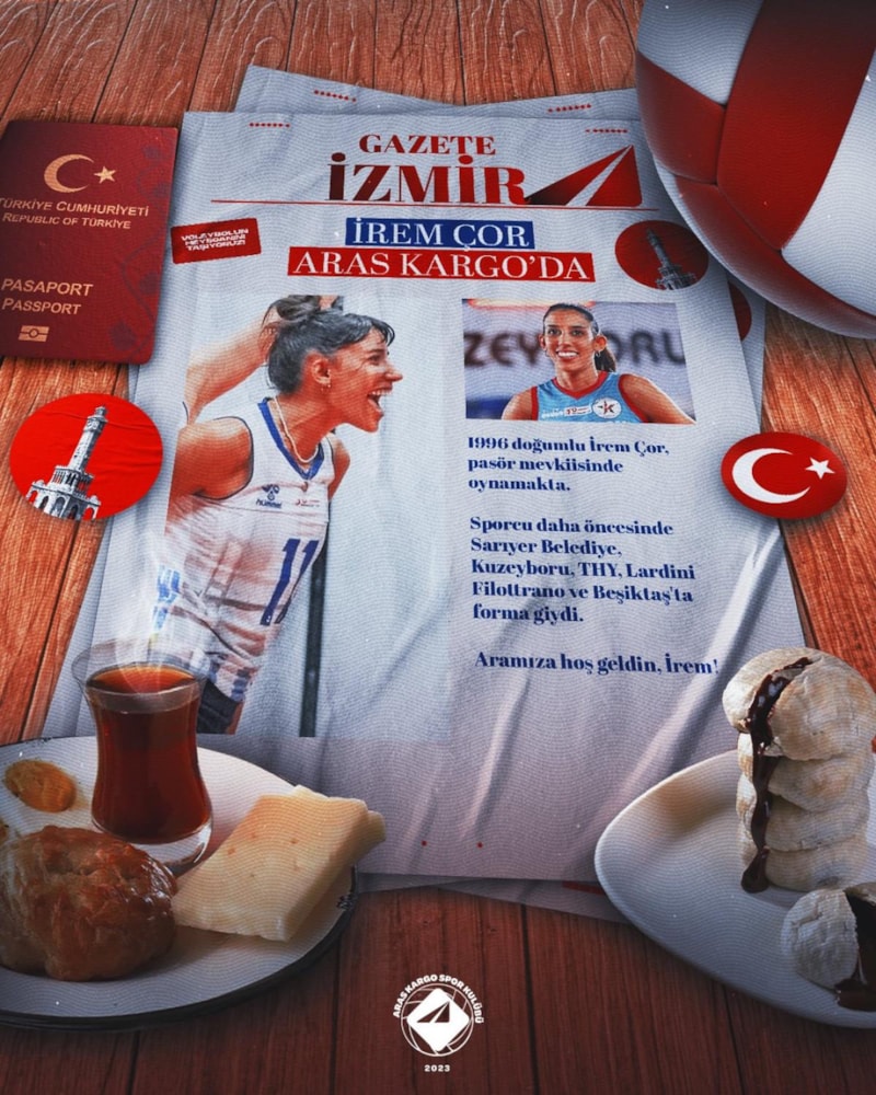 Bu gazetede bir sürü pas var. İzmir'imize hoş geldin. 1996 doğumlu İrem Çor, pasör mevkisinde oynamakta. Sporcu daha öncesinde Sarıyer Belediye, Kuzeyboru, THY, Lardini, Filottrano ve Beşiktaş'ta forma giydi. Aramıza hoş geldin İrem.