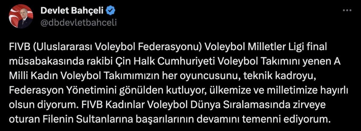 Bahçeli, sosyal medya hesabı üzerinden yaptığı paylaşımda, "FIVB Voleybol Milletler Ligi final müsabakasında rakibi Çin Halk Cumhuriyeti Voleybol Takımı'nı yenen A Milli Kadın Voleybol Takımımızın her oyuncusunu, teknik kadroyu, federasyon yönetimini gönülden kutluyor, ülkemize ve milletimize hayırlı olsun diyorum. FIVB Kadınlar Voleybol Dünya Sıralaması'nda zirveye oturan Filenin Sultanları'na başarılarının devamını temenni ediyorum" ifadelerini kullandı.