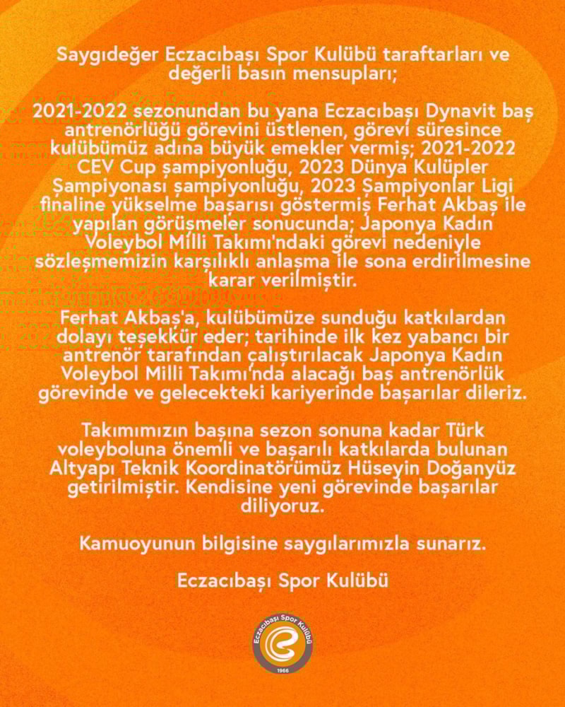 2021-2022 sezonundan bu yana Eczacıbaşı Dynavit baş antrenörlüğü görevini üstlenen, görevi süresince kulübümüz adına büyük emekler vermiş; 2021-2022 CEV Cup şampiyonluğu, 2023 Dünya Kulüpler Şampiyonası şampiyonluğu, 2023 Şampiyonlar Ligi finaline yükselme başarısı göstermiş Ferhat Akbaş ile yapılan görüşmeler sonucunda; Japonya Kadın Voleybol Milli Takımı’ndaki görevi nedeniyle sözleşmemizin karşılıklı anlaşma ile sona erdirilmesine karar verilmiştir.