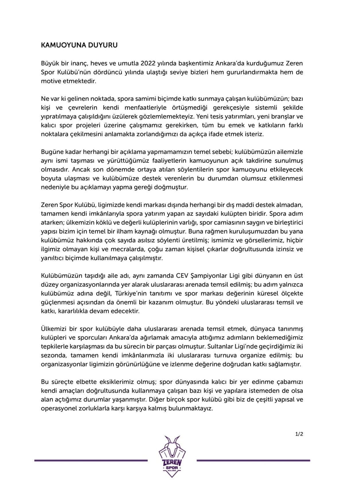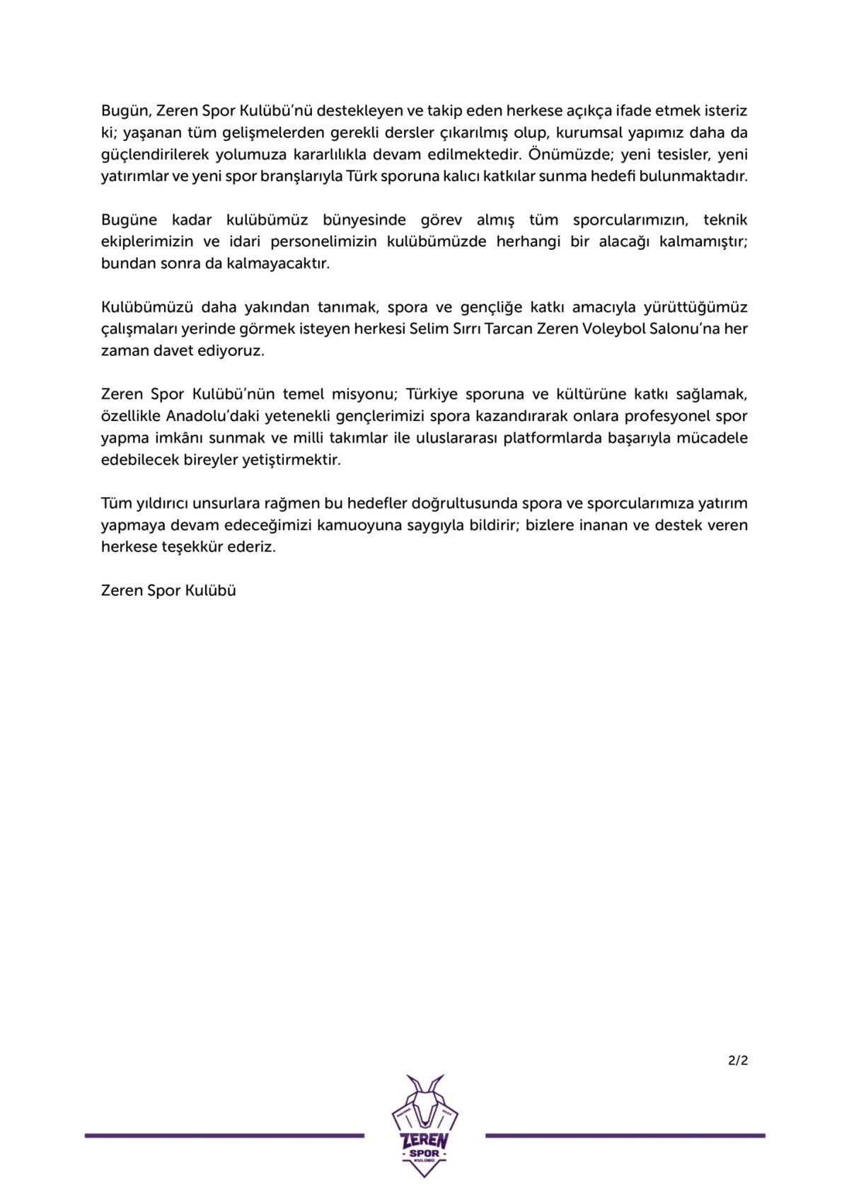 - Zeren Spor Voleybol Kulübü, "maddi zorluk yaşandığı" iddialarını reddetti.