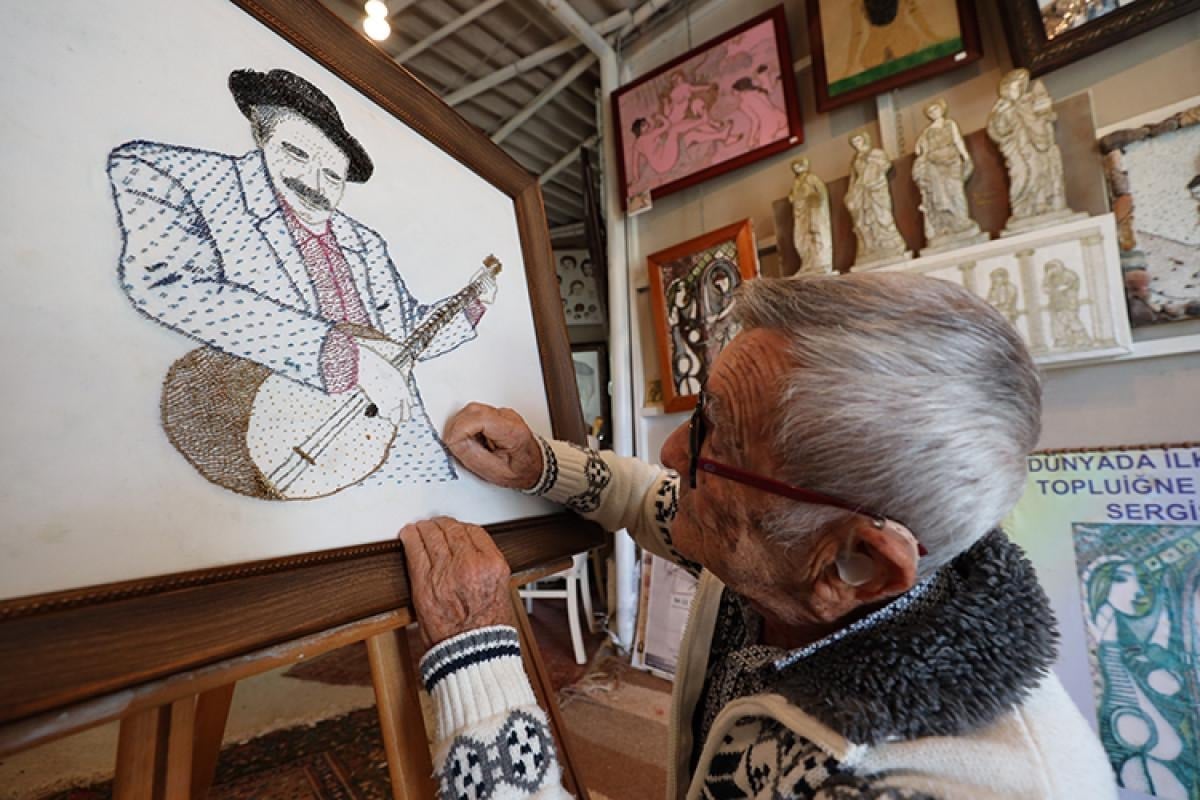 Yurtsever, çalışmalarını sürdürdüğü evinin atölyesinde Aşık Veysel'i anmak için toplu iğne çalışması yaptığını söyledi.