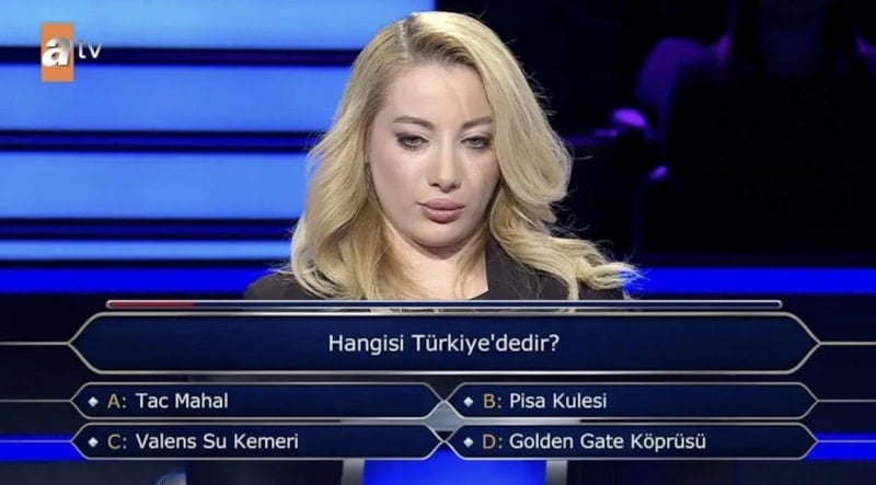 Tac Mahal, Pisa Kulesi, Golden Gate Köprüsü ve Valens Su Kemeri şıkları arasında yarışmacı, joker hakkını da kullanarak doğru cevaba ulaştı.
