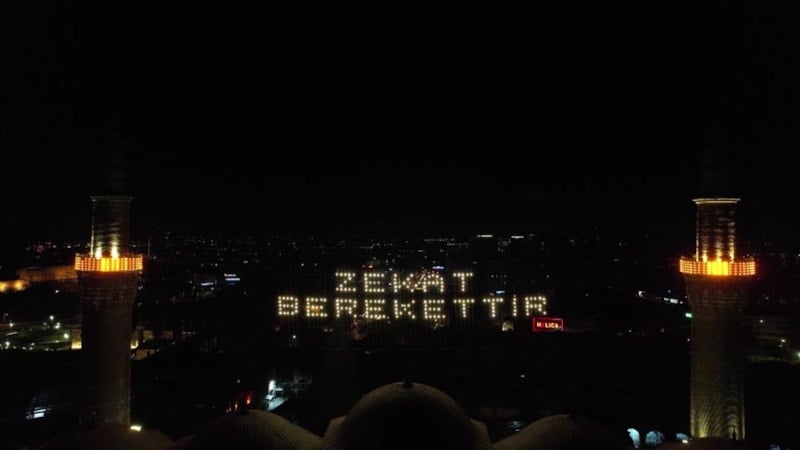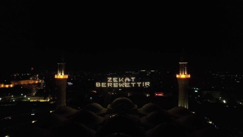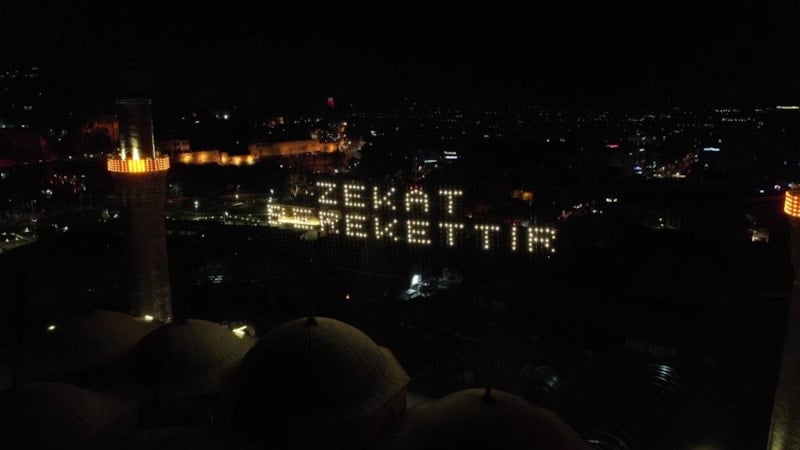 Ramazan ayının başında camiye asılan “Kul hakkından sakın” yazılı mahyanın yerine bu kez “Zekat Berekettir” mesajı yerleştirildi.
