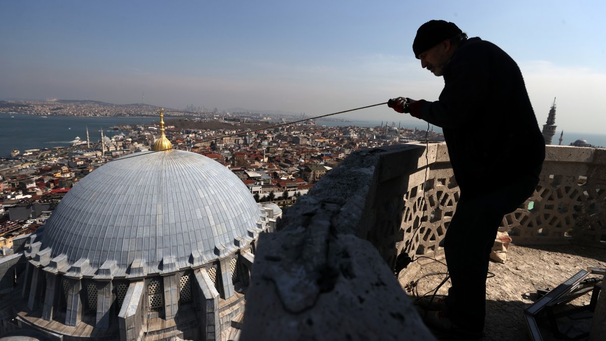 Kahraman Yıldız ve ekibi öğle saatlerinde Süleymaniye Camisi'ne geldi. Ramazan boyunca değişik yazıların yer alacağı mahyanın iki minare arasına yerleştirilmesi için çalışma yapıldı.