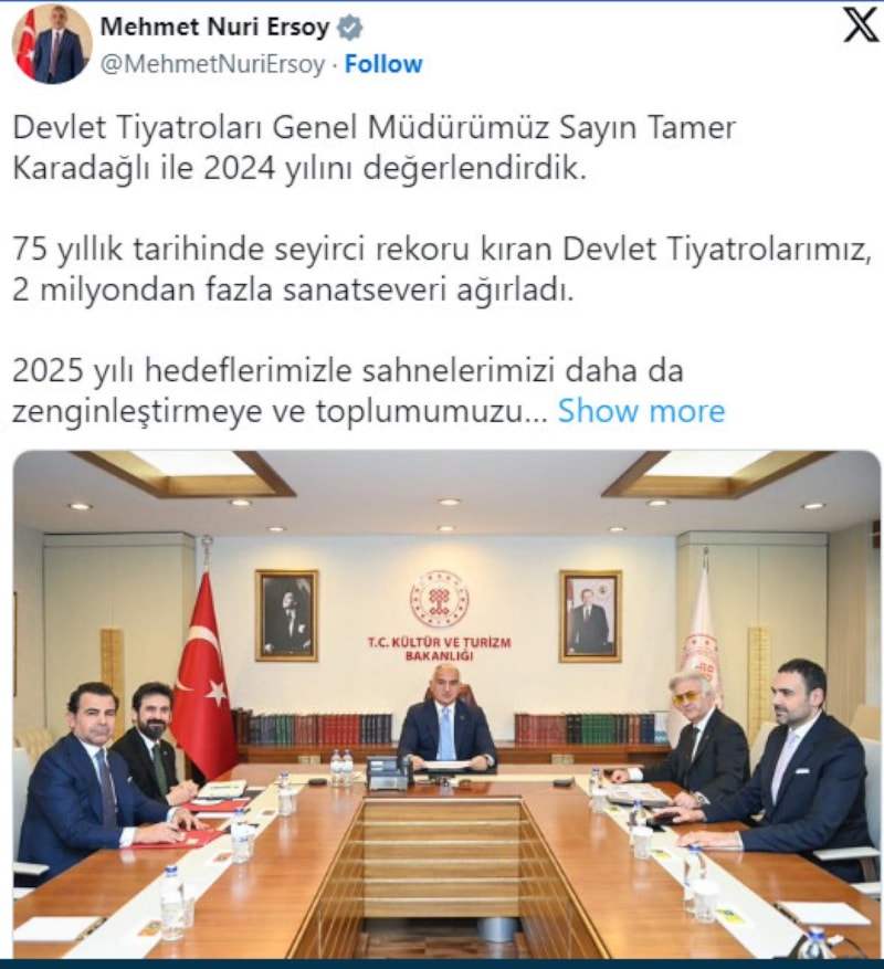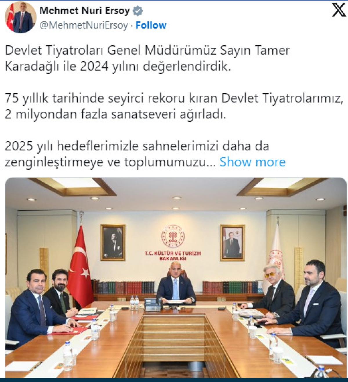 Kültür ve Turizm Bakanı Mehmet Nuri Ersoy, sosyal medya hesabından yaptığı paylaşımda, Devlet Tiyatroları Genel Müdürü Tamer Karadağlı ile 2024 yılını değerlendirdiklerini belirtti.