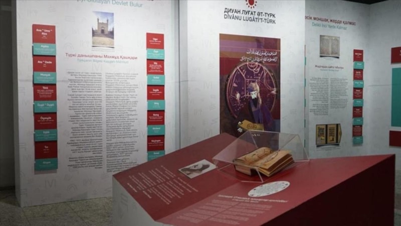 Türk Dünyası Vakfı ile Türk Kültür ve Miras Vakfı iş birliğiyle Kazakistan Milli Müzesi'nde açılışı yapılan sergide, Divanu Lugati't-Türk'ün tarihi serüveni ve içeriğine dair bilgiler yer alıyor.