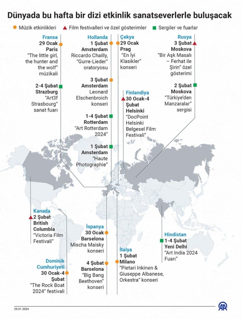 Dünyanın çeşitli şehirlerinde bu hafta geniş bir yelpazede, birbirinden farklı etkinliklerin yanı sıra konser, sergi, tiyatro ve performanslar gerçekleştirilecek.