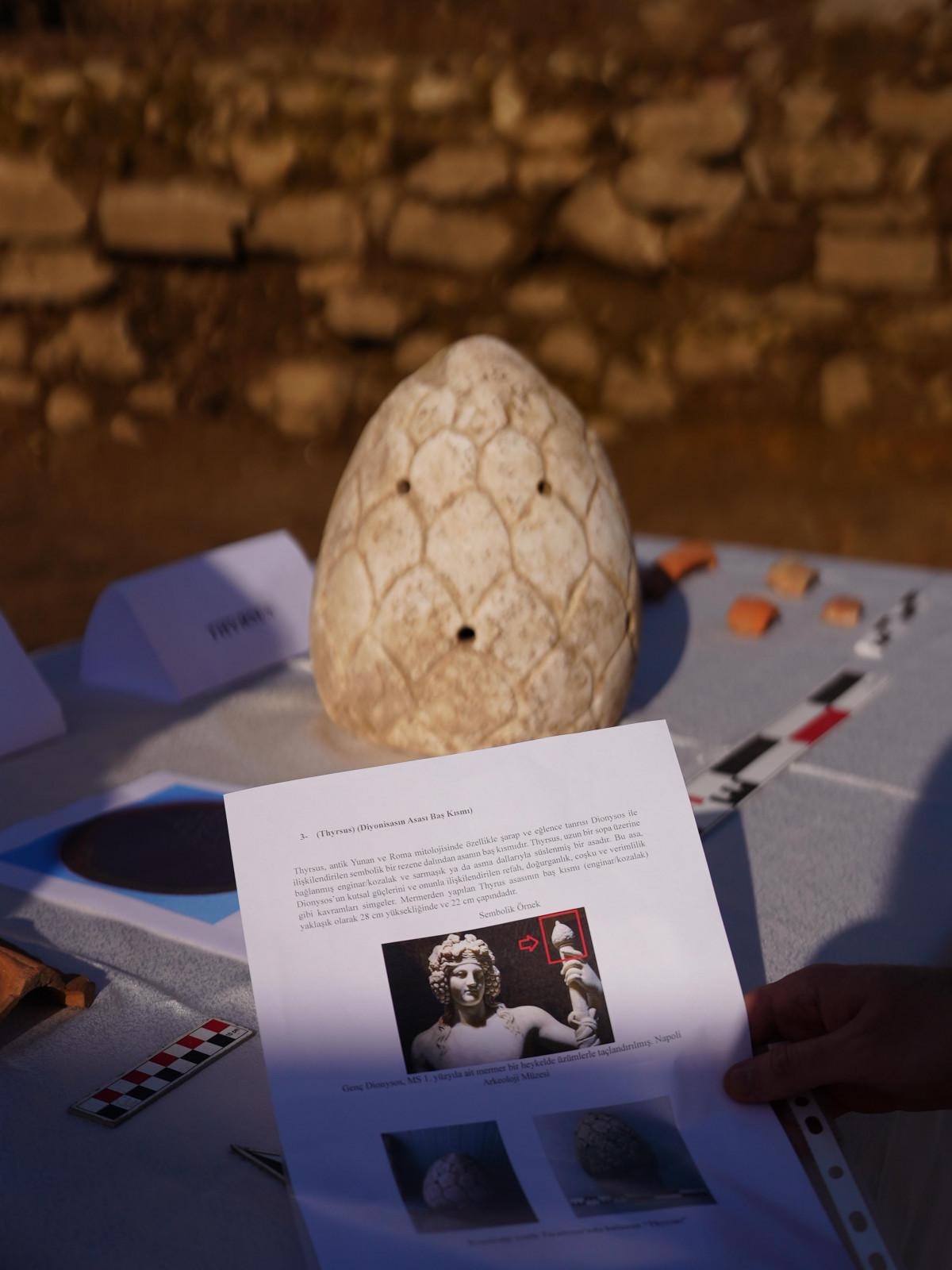 En büyük buluntumuz ise Thyrsus, antik Yunan ve Roma mitolojisinde özellikle şarap ve eğlence tanrısı Dionysos ile ilişkilendirilen sembolik bir rezene dalından asanın baş kısmıdır. Thyrsus, uzun bir sopa üzerine bağlanmış enginar, kozalak ve sarmaşık ya da asma dallarıyla süslenmiş bir asadır” ifadelerini kullandı.