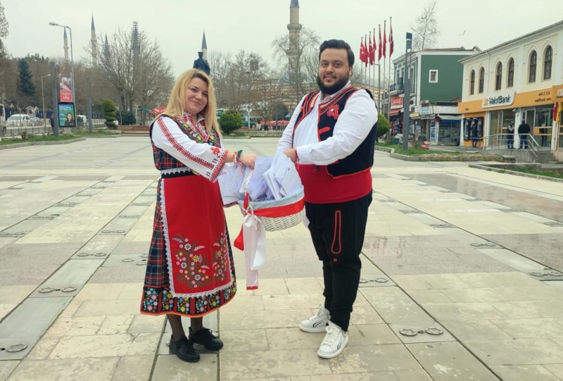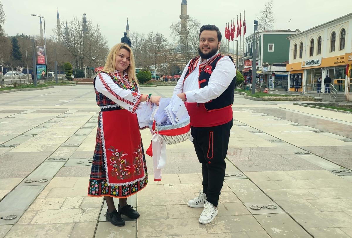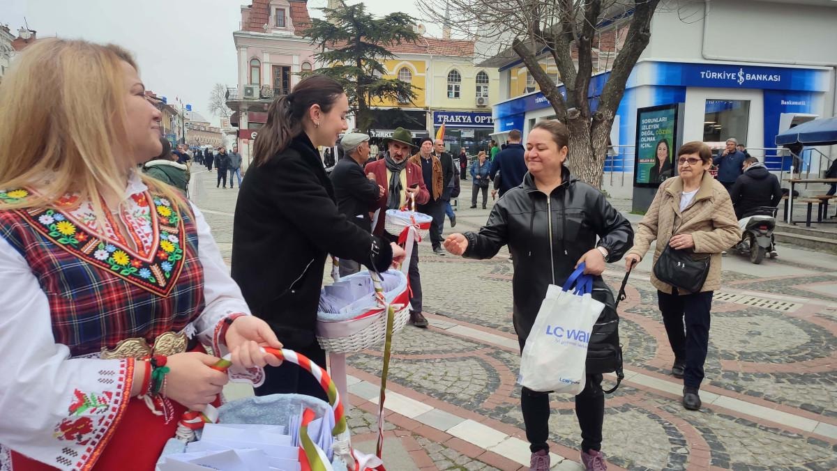 Bugün 1 Mart dolayısıyla buradayız. Baharın gelmesini müjdeleyen bu 'marteniçka'ları dağıtmak bizim için eski bir gelenek. Bizim hem Türkiye ile hem de Edirne halkıyla çok dostane ilişkilerimiz var ki bu gelenek artık Edirne'ye de sıçradı. Her sene Mart'ın 1'inde taktığımız bu beyaz- kırmızı renkte bileklikler sağlık, bereket, huzur, dostluk ve özgürlüğü simgeliyor. Bugünden itibaren artık ilkbaharı heyecanla beklemeye başlıyoruz, doğanın yeniden canlanmasını kutluyoruz. Leylek görene kadar da bunları takıyoruz, leyleği gördüğümüzde de dilek dileyip ağaca bağlıyoruz.