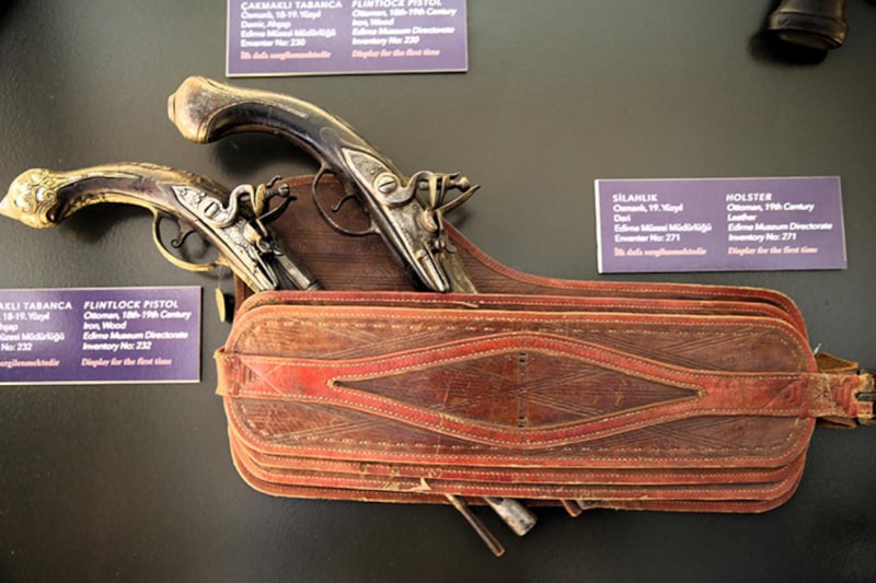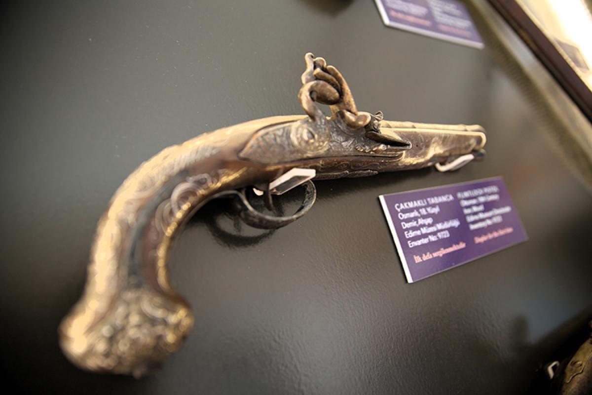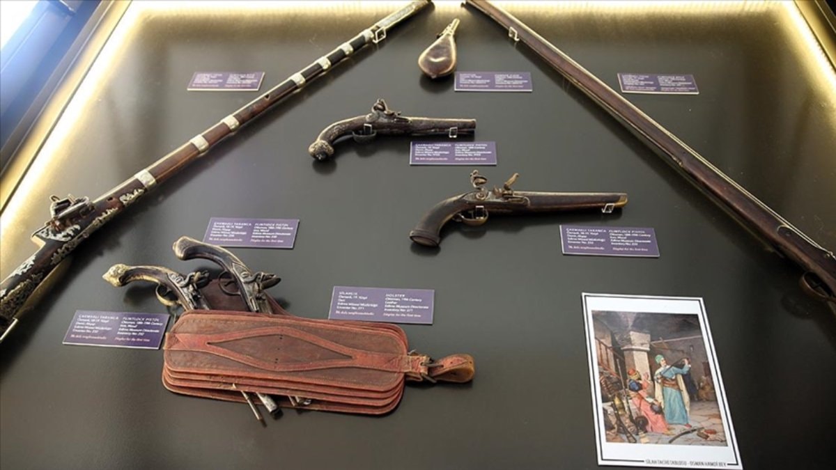 Edirne Müzesi Müdürlüğü'nün ateşli ve ateşsiz silahlar koleksiyonunda bulunan farklı dönemlere ait sapan taşları, el baltaları, ok uçları, teberler, kılıçlar, tabanca ve silahlardan oluşan sergi, ziyaretçileri zamanda yolculuğa çıkarıyor.