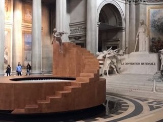 Akrobat, aktör ve dansçı olan Bourgeois, "Mechanics of History" (Mekaniğin Tarihi) adlı gösterisini bu kez Le Pantheon'un en yüksek kubbesinde asılı bulunan Focault sarkacının altında sundu. Daha önce de farklı anıtlarda sergilediği performans içinde trambolin olan bir merdivenli dönence üzerinde gerleşiyor. Bourgeois ve arkadaşları dikkat çekici bir uyum içinde merdivenlerden çıkıyor ve trambolinde zıplıyor.