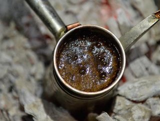 Daha sonra gümgüm adı verilen büyük cezve içinde, mangaldaki közde yaklaşık 2 saat kaynatılan kahve, belli aşamalarda telvesinden ayrıştırılıyor.