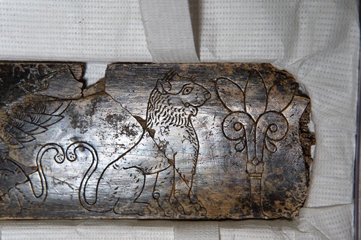 Yaklaşık 30 santimetre uzunluğunda, 10 santimetre genişliğindeki fil dişi parçada, parlak zemin üzerine çizilen bir sfenks (insan başlı, hayvan vücutlu heykel), bir aslan ile iki yaşam ağacı figürü bulunuyor.