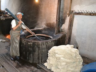 Boya kazanını her sabah ilk günkü heyecanla yakan Ali İhsan Karaağaç, sipariş edilen iplere vereceği renkleri elde etmek için kök boyaları özenle hazırlıyor.
