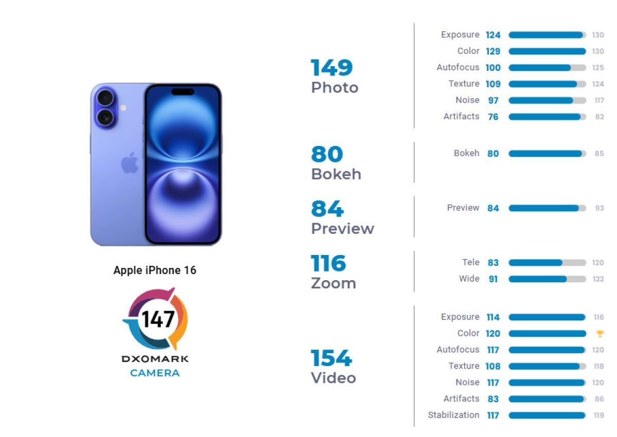 DxOMark'ın incelemesine göre iPhone 16, iyi bir fotoğraf kalitesi sunuyor olsa da en iyi olmaktan oldukça uzak.