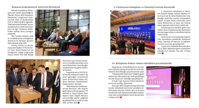 Bu sayımızda, Milli Kütüphanenin tarihi, kütüphane diplomasisi, açılışı yapılan kütüphane binaları, koleksiyon geliştirme çalışmaları, dijitalleştirme faaliyetlerimiz ve gerçekleştirdiğimiz uluslararası faaliyetler konuları öne çıkıyor.