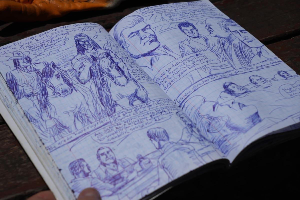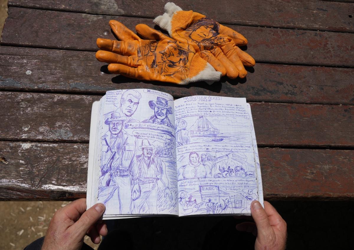 Çevrede temizlik yaparken bulduğu kullanılmış ancak boş sayfaları olan defterleri de sanatının bir parçası haline getiren Gündoğdu, bu sayfalarda hayal dünyasından esinlenen çizgi romanlar çiziyor.