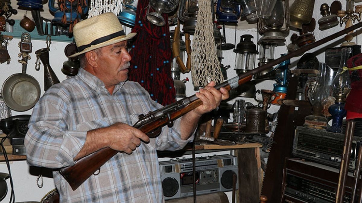 "Ecdadımızın kullandığı Fransız malı mavzeri Mersin'den bir kadından aldım. O zamanlar 400 lira para verdim. Osmanlı zamanında ağır mahkumlara takılan bir pranga var, yaklaşık 200 yıllık. Bir kilise çanı var, tarihi 1817. Yaklaşık 100 yıllık körük var. 100 yıllık müzik aleti cümbüş var. Dedelerimizin kullandığı çevirmeli telefon, yaklaşık 60 senelik. Bunlar hep kültür mirası. Burada yaklaşık 250-300 senelik kültür mirası var. Her türlü ev, el, tarım, müzik aleti var. Çok ilginç camız hamudu var, hiçbir hamut ona benzemez. Milli boksörümüz Cemal Kamacı'nın eldiveni, çalışma aparatlarının bende olması gurur verici. Antalya Adliyesi'nde kullanılan bir daktilo var. Üzerinde damga ve mühür var. Kim bilir kimlere ne kadar ceza kesildi, af oldu. Bunu emekli bir hakimin hanımından aldım."