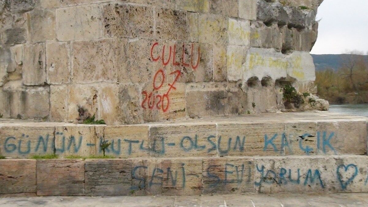 Araç trafiğine kapalı 225 metre uzunluğundaki köprünün her tarafına boyalarla yazılan yazılar ve yakılan ateşlerin bıraktığı siyah görüntü görsel kirliliğe neden olurken, ziyaretçilerin de tepkisini çekiyor.