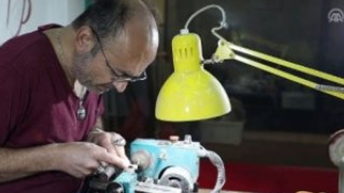 Çarşıda biri imalathane olmak üzere 36 metrekarelik iki dükkan kiralayan Ağca, başta tespih olmak üzere birçok eşyayı sedef kakma, oymacılık ve tel işleme teknikleri uygulayarak sanat eserine dönüştürüyor.