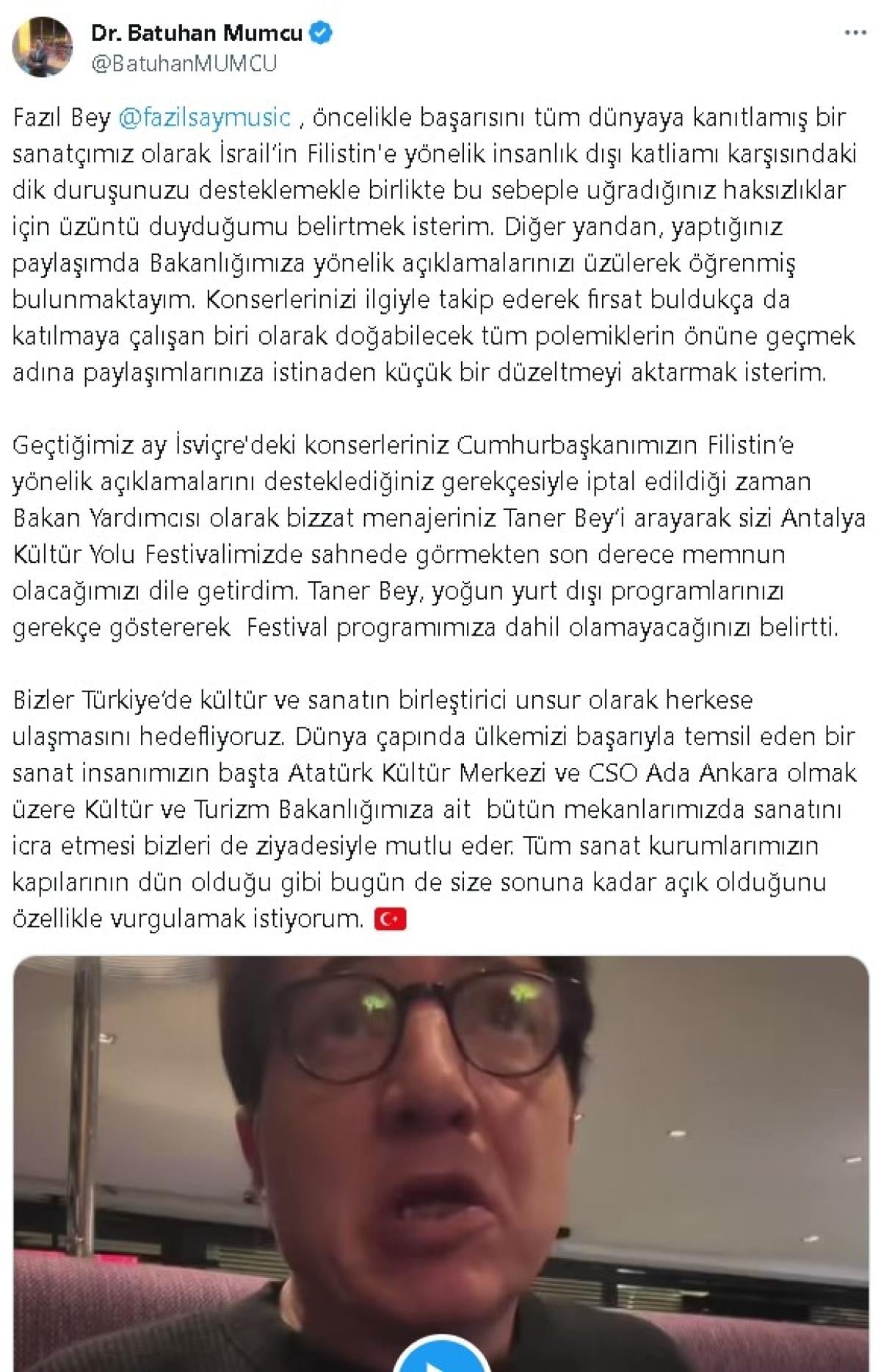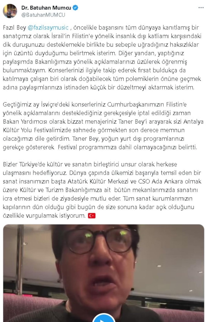 Fazıl Say'ın bu eleştirisine Kültür ve Turizm Bakanı Yardımcısı Batuhan Mumcu'dan yanıt geldi.