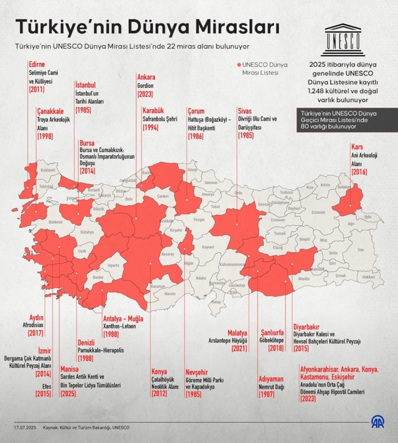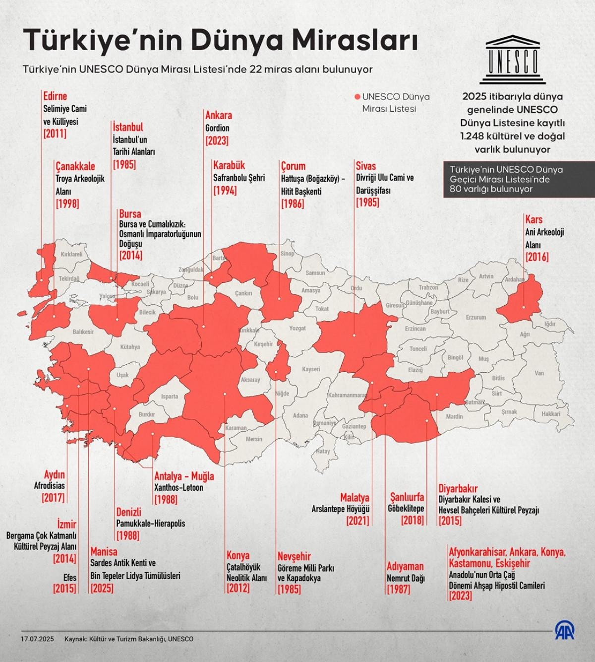 Manisa'da "Sardes Antik Kenti ve Bin Tepeler Lidya Tümülüsleri"nin, UNESCO Dünya Miras Listesi'ne kaydedilmesiyle birlikte Türkiye'nin UNESCO Dünya Miras Listesi'ndeki alanlarının sayısı 22'ye ulaştı.