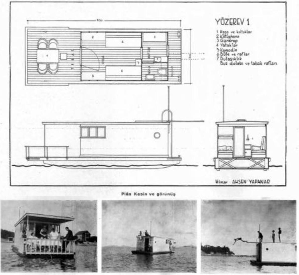 Eski yıllardaki bir gazetede, yüzen evler şu satırlarla tanıtılmıştı: “Takriben 25 metre murabbaı bir tekne üzerine, bir yatak ve oturma odası, mutfak, helâ ve önünde küçük terasdan ibaret olarak yapılan bu yüzen ev, İstanbul sahillerinde banyo mevsiminde kullanılmak ve istifade edilmek üzere inşa edilmiştir.