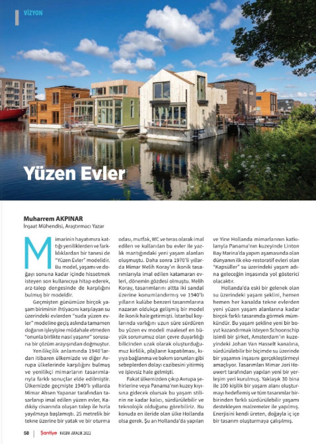 - İnş. Müh. Muharrem Akpınar, “Yüzen Evler”, Şantiye Dergisi, Aralık 2022