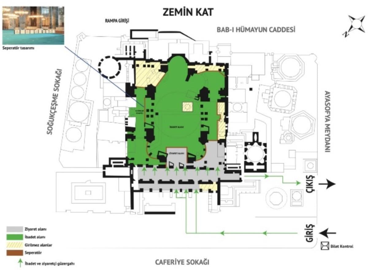 Ziyaretçi Yönetim Sistemi ile zemin ve galeri kat girişleri ayrılacak. Turistik amaçlı ziyaretçiler Ayasofya Meydanı girişinden kontrollü şekilde camiye geçiş yapacaklar. Aynı şekilde galeri de ziyaret edilebilecek.