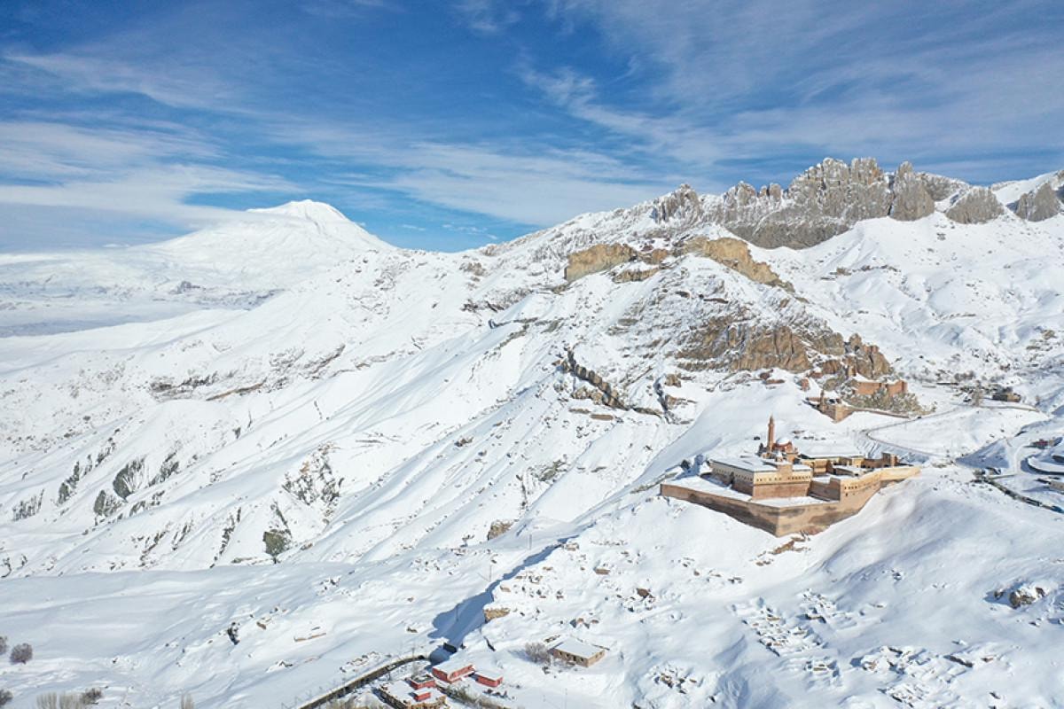 Türkiye'nin 5137 metreyle en yüksek dağı olan Ağrı Dağı'nın eteklerindeki ilçede yer alan İshak Paşa Sarayı ile çevresi karla kaplandı.