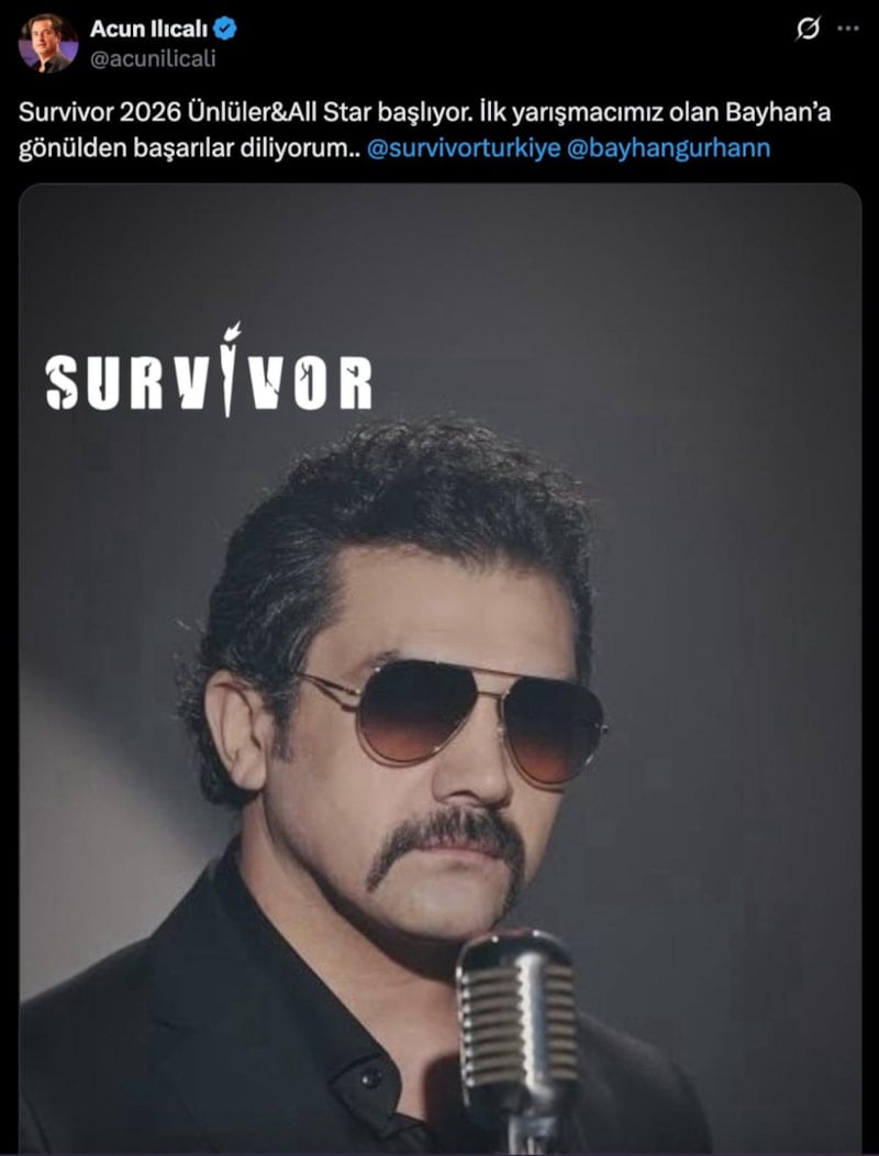 Ilıcalı, heyecanlandıran paylaşımına şu notu düştü: "Survivor 2026 Ünlüler&All Star başlıyor. İlk yarışmacımız olan Bayhan’a gönülden başarılar diliyorum."