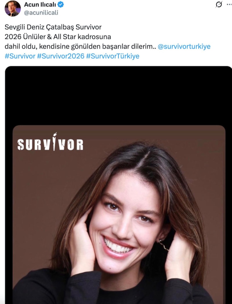 Acun Ilıcalı, Deniz Çatalbaş'ın Survivor'da yarışacağını sosyal medya hesabından "Sevgili Deniz Çatalbaş Survivor 2026 Ünlüler & All Star kadrosuna dahil oldu. Kendisine gönülden başarılar diliyorum." sözleriyle açıkladı.