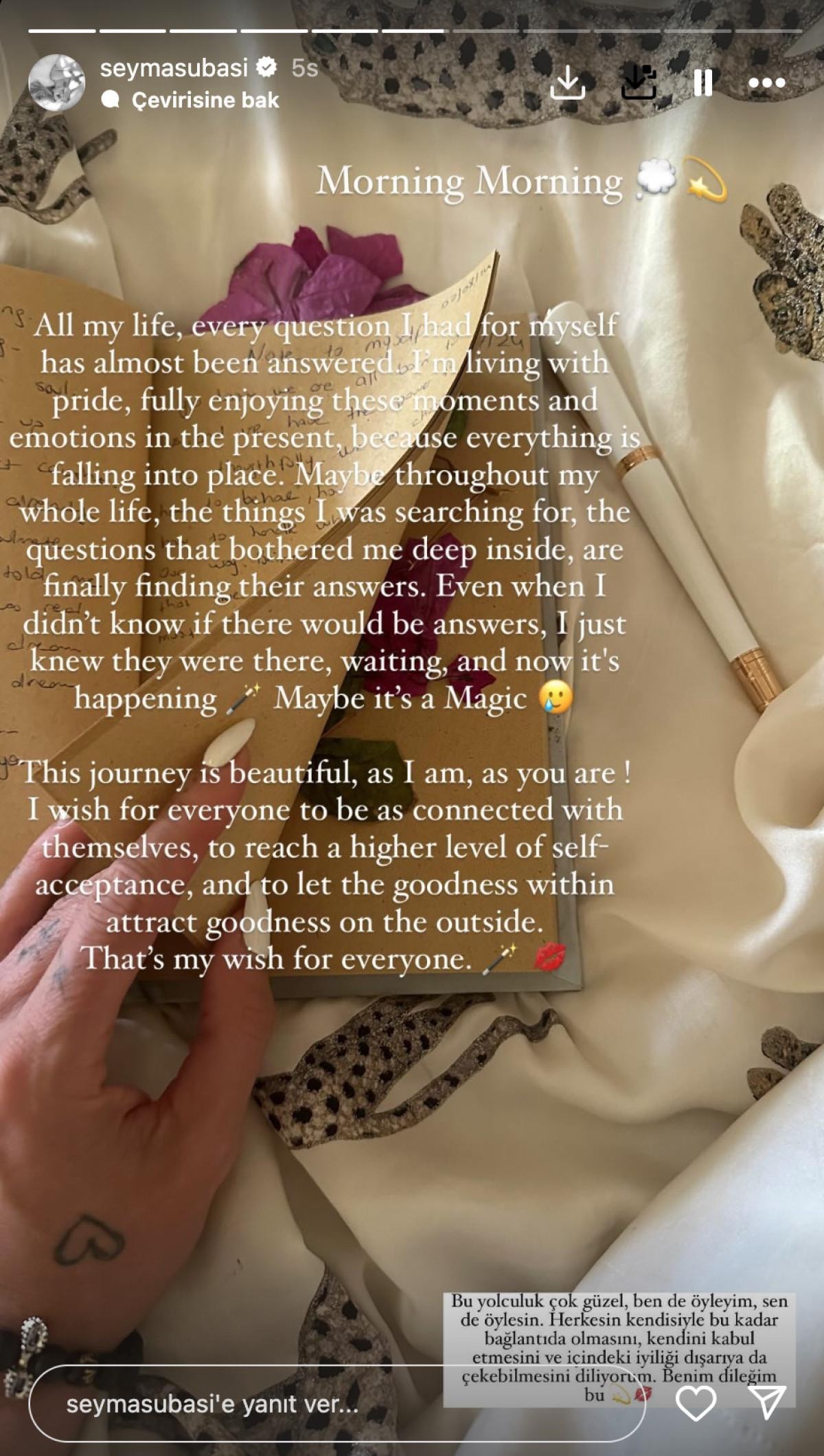 Bu yolculuk güzel, benim gibi, senin gibi ! Herkesin kendine bağlı olmasını, kendini kabul etme seviyesine ulaşmasını, içindeki iyiliğin dıştaki iyiliği çekmesini diliyorum. Herkes için dileğim bu."