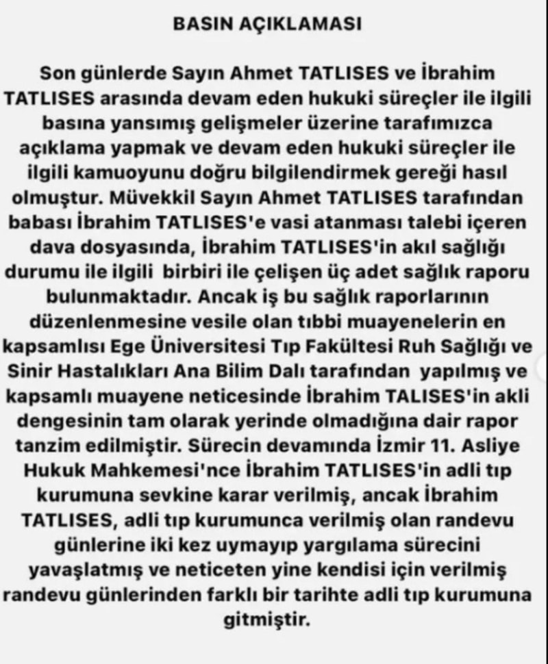 Açıklamada, "İbrahim Tatlıses'in akıl sağlığı durumu ile ilgili birbiri ile çelişen üç adet sağlık raporu bulunmaktadır. Kapsamlı muayene neticesinde İbrahim Tatlıses'in akli dengesinin tam olarak yerinde olmadığına dair rapor tanzim edilmiştir." ifadesine yer verildi.