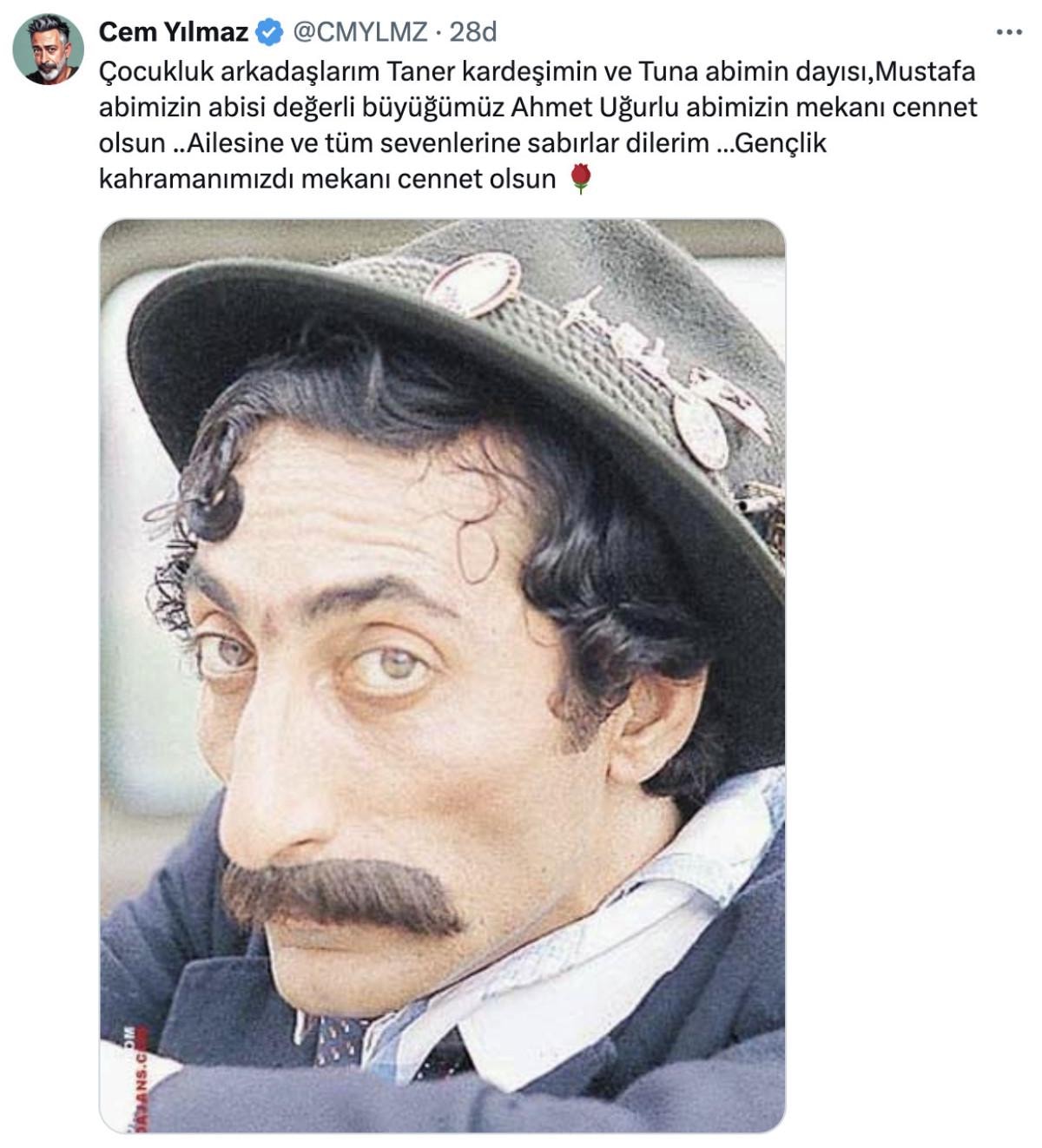Cem Yılmaz da, "Çocukluk arkadaşlarım Taner kardeşimin ve Tuna ağabeyimin dayısı, Mustafa ağabeyimizin ağabeyi değerli büyüğümüz Ahmet Uğurlu ağabeyimizin mekanı cennet olsun. Ailesine ve tüm sevenlerine sabırlar dilerim. Gençlik kahramanımızdı mekânı cennet olsun" dedi.