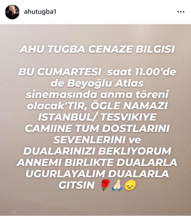 Tuğba'nın cenaze töreniyle bilgi de sosyal medya hesabı üzerinden paylaşıldı. Tuğba için 28 Eylül'de önce anma töreni düzenlenecek. Tuğba'nın cenazesi, Teşvikiye Camii'nde öğle namazına müteakip kılınacak cenaze namazı sonrasında Zincirlikuyu Mezarlığı'ndaki annesinin mezarına defnedilecek.