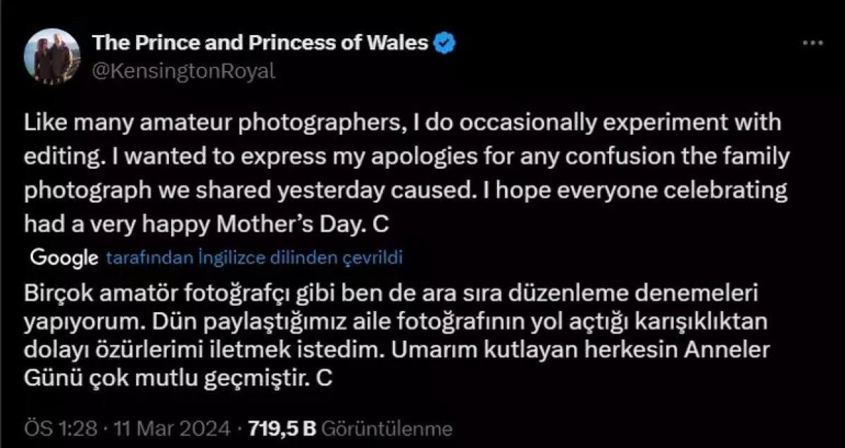 Resmi hesaptan bir kez daha tweet atıldı ve Kate Middleton’ın ağzından “Birçok amatör fotoğrafçı gibi ben de ara sıra düzenleme denemeleri yapıyorum. Dün paylaştığımız aile fotoğrafının yol açtığı karışıklıktan dolayı özürlerimi iletmek istedim. Umarım kutlayan herkesin Anneler Günü çok mutlu geçmiştir. C” açıklaması yapıldı.