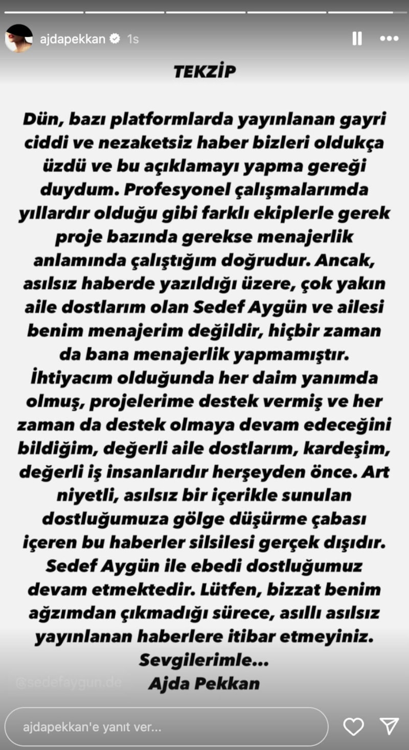 Dün bazı platformlarda yayınlanan gayri ciddi ve nezaketsiz haber, bizleri oldukça üzdü ve bu açıklamayı yapma gereği duydum. Asılsız haberde yazıldığı üzere, çok yakın aile dostlarım olan Sedef Aygün ve ailesi benim menajerim değildir, hiçbir zaman da bana menajerlik yapmamıştır.