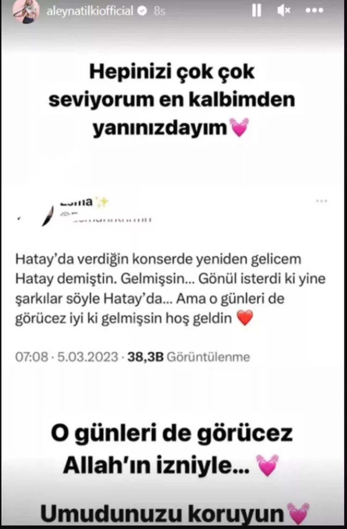 Şarkıcı, hayranının; "Hatay'da verdiğin konserde 'Yeniden geleceğim Hatay'a' demiştin. Gelmişsin... Gönül isterdi ki yine şarkılar söyle Hatay'da. Ama o günleri de göreceğiz. İyi ki gelmişsin. Hoş geldin" yazısını Instagram hesabının hikayeler bölümünden paylaştı.