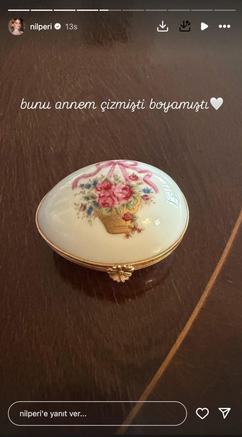 Nilperi Şahinkaya, annesinin çizip boyadığı bir kutuyu "Bunu annem çizmişti, boyamıştı." notuyla takipçileriyle paylaştı.