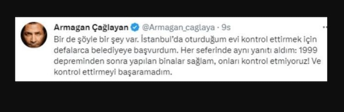 Depremlerin ardından İstanbul'da oturduğu evin depreme dayanıklı olup olmadığını öğrenmek isteyen Çağlayan, Twitter hesabından yaptığı paylaşımda belediyeye başvurduğunu ancak defalarca kez olumsuz cevap aldığını söyledi: