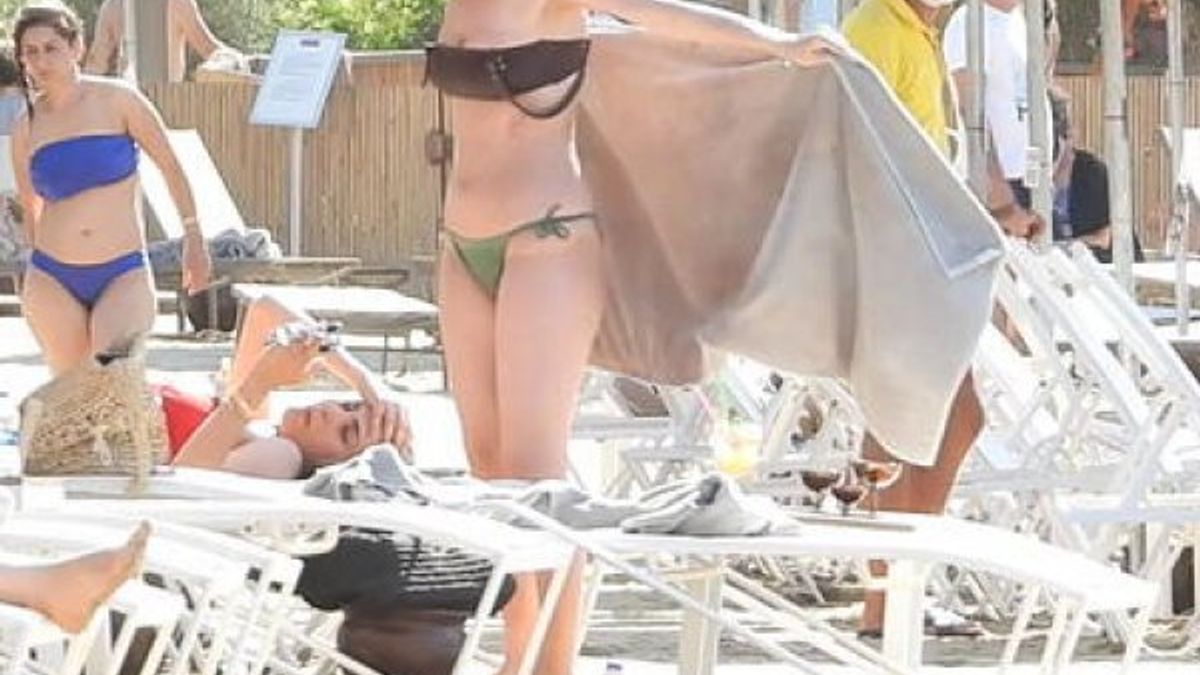 Üstsüz güneşlenen Aslıhan Güner, kadın arkadaşına güneş kremi sürdürdükten sonra sonra yüzüstü yatarak saatlerce güneşlendi. Güner, daha sonra denize girerek ferahladı.