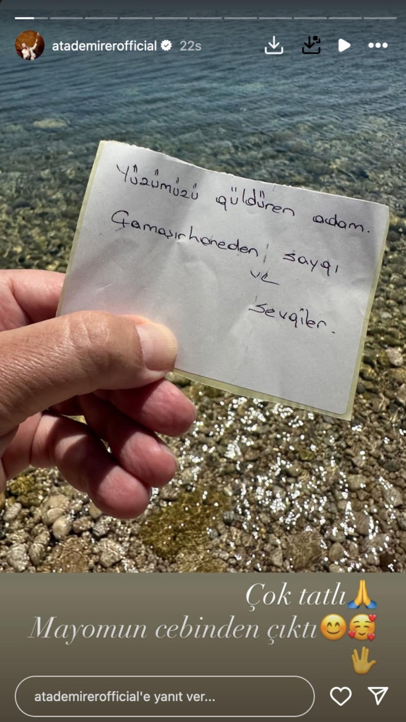 Denizin ve yazın keyfini çıkaran Demirer, mayosunun cebinde bir not kağıdı buldu. Kağıtta yazılanları okuyup duygulandı. Ardından bu notu paylaştı. İşte o notta yazılanlar: “Yüzümüzü güldüren adam. Çamaşırhaneden saygı ve sevgiler.”