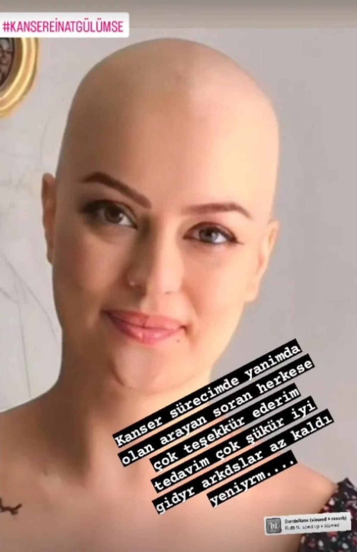 3 aydır aldığı tedavinin olumlu sonuçlar verdiğini ve bu süreci atlatacağını söyleyen oyuncu, Instagram hesabından "Kansere inat gülümse" notuyla peruksuz bir fotoğrafını yayınladı.