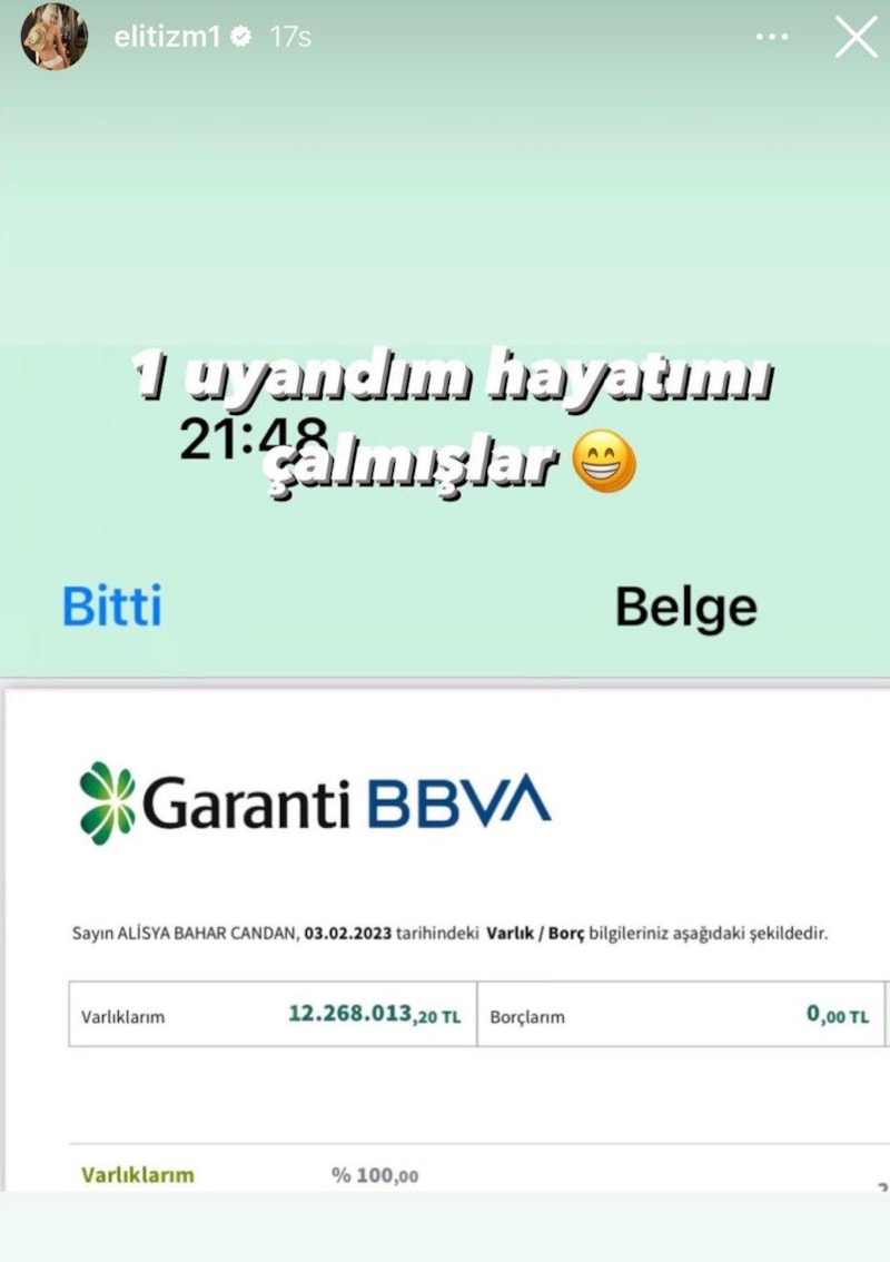 İnstagram hesabından bankasındaki parasını ekran görüntüsü alan Bahar Candan, "bir uyandım hayatımı çalmışlar" notuyla paylaşım yaptı.