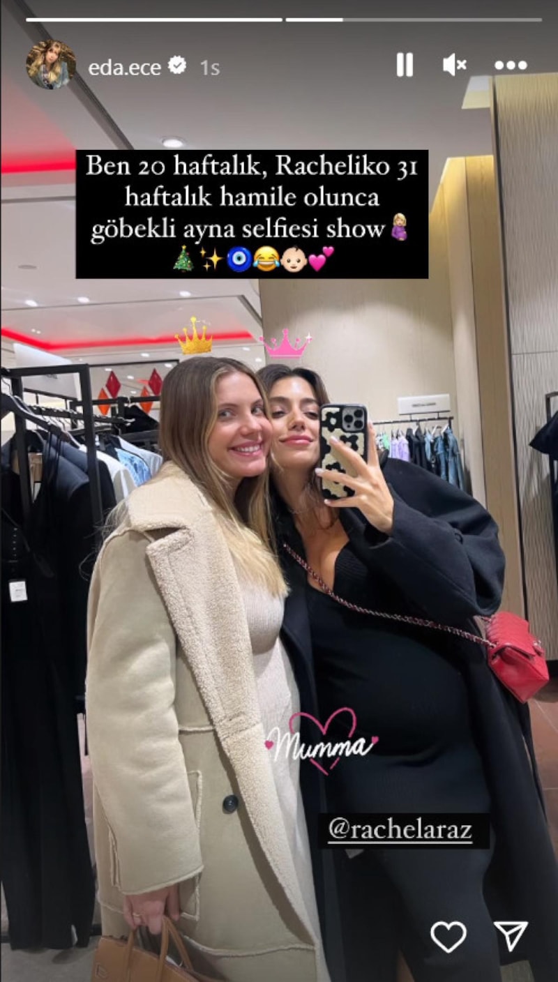 İlk üç ayını zor geçiren Ece, 7,5 aylık hamile fenomen Rachel Araz ile alışverişe çıktı. Araz ile ayna karşısına karınlarını göstererek verdiği pozu yayınlayan Ece, "Ben 20 haftalık, Racheliko 31 haftalık hamile olunca göbekli ayna selfiesi" notunu yazdı.
