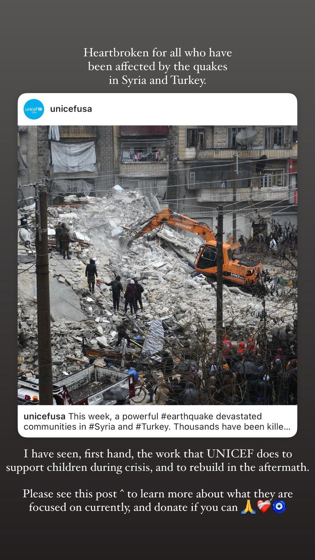 Instagram hesabından paylaşım yapan Gigi Hadid, Türkiye ve Suriye için çok üzgün olduğunu söyleyerek 80 milyona yakın takipçisini UNICEF'e bağış yapmaya çağırdı.