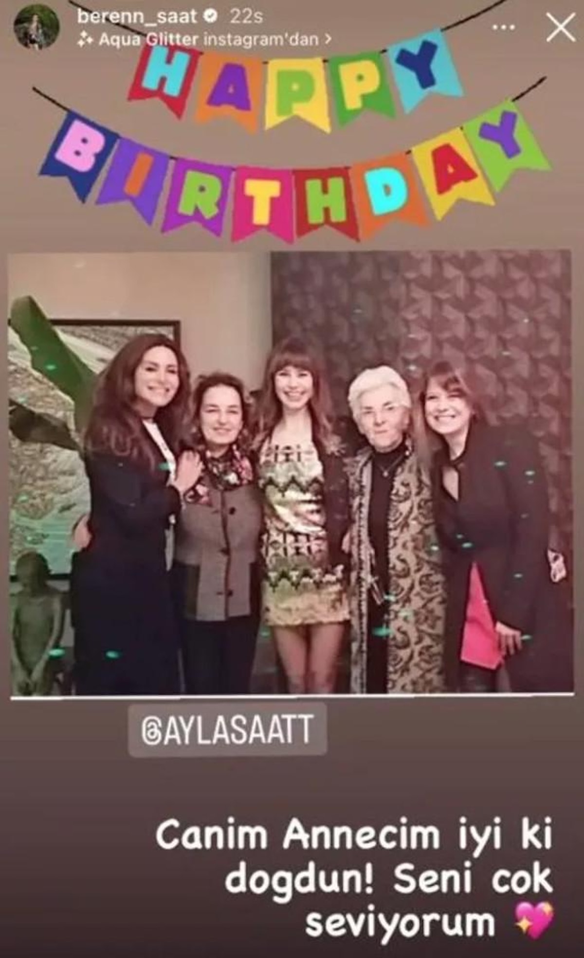 Annesi Ayla Saat'in doğum gününü kutlayan Beren Saat, paylaştığı fotoğrafa "Canım anneciğim iyi ki doğdun. Seni çok seviyorum" notunu düştü.
